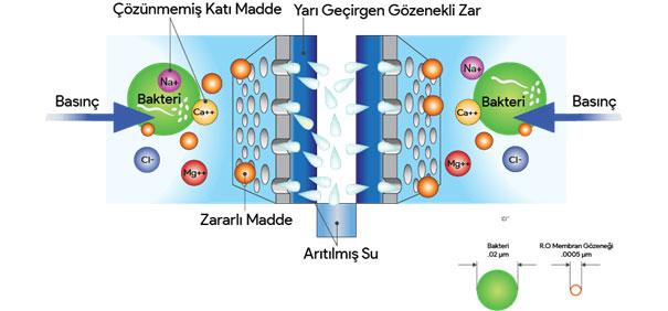 Ters ozmoz suyu arıtma süreci; Su arıtma cihazı içindeki membran filtre aracılığıyla çalışan ters ozmoz arıtılmamış suya iki taraflı basınç uygular ve yarı geçirgen zardan geçirilerek su arıtma cihazında bulunan diğer filtre aşamasına geçer böylece arıtma görevini tamamlamış olur.